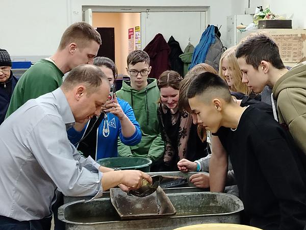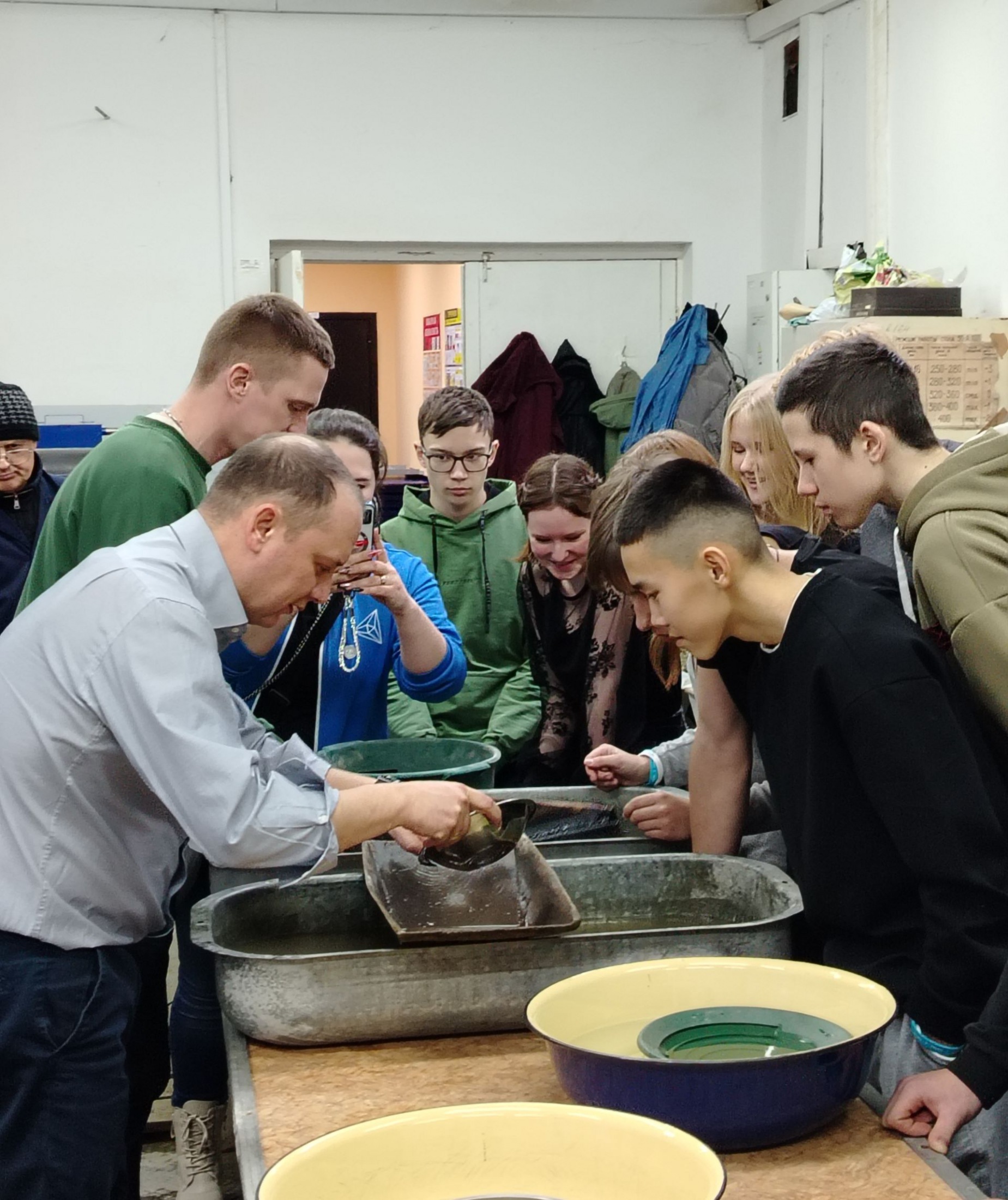 На площадке Центра коллективного пользования «Центр исследования минерального сырья» сотрудники Института горного дела ДВО РАН провели для школьников практическое занятие по шлиховому опробованию минеральной массы (песков) с помощью промывочных лотков.